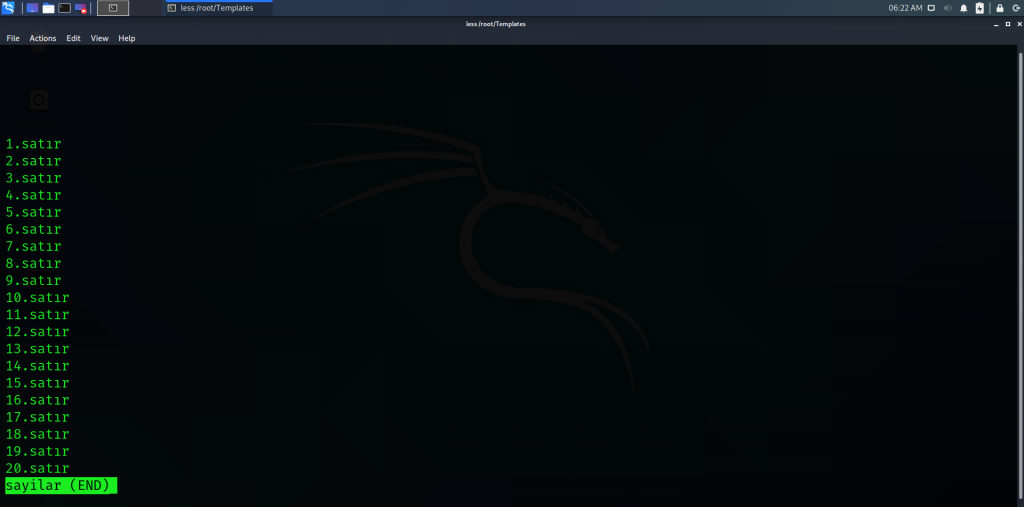 3) less: More komutunun daha gelişmiş halidir. Sayfalar arasında hem ileriye hem de geriye doğru okuma yapma imkanı sağlar. Less komutu ile açılmış sayfanın bir örneğini aşağıda görebilirsiniz