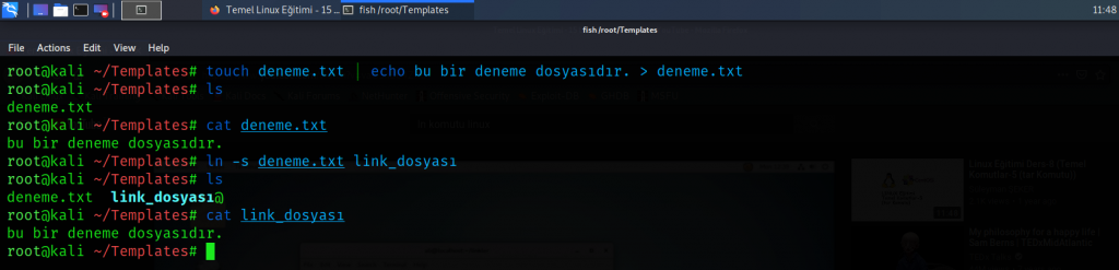 10) ln(link): Bir dosyaya farklı bir dosya oluşturarak oluşan yeni dosya üzerinden erişim sağlamaya olanak tanır .Windows işletim sistemlerinde ki kısayol oluşturma işlemi gibi düşünülebilir. Soft link ve hard link olmak üzere iki çeşittirler. Soft linkler disk üzerinde yer kaplamazlar ancak orijinal dosya silinirse veya ismi değiştirilirse bu linkler çalışamazlar. Temel kullanımı “ln -s <dosya_adi> <oluşacak_linkin_adi>” şeklindedir. Hard linkler ise orijinal dosya silindiğinde veya ismi değiştiğinde dahi çalışmaya devam edebilirler. Temel kullanımları “ln <dosya_adi> <oluşacak_linkin_adi> şeklindedir.”