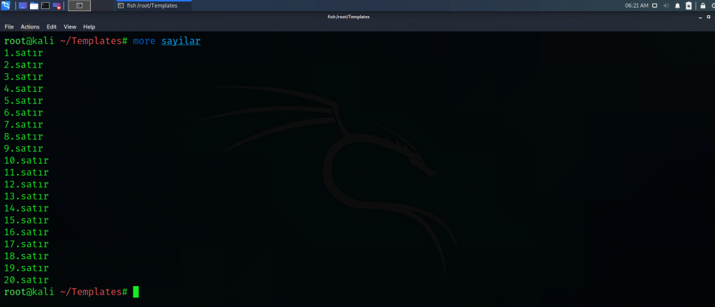 2) more: Ekranda oluşacak çıktıyı daha dikkatli incelenebilmesi için sayfalar şeklinde açar. Sadece ileriye doğru okumalar yapar, sayfalar arasında ilerleyebilmek için space (boşluk) tuşu kullanılır. Komutun temel kullanımı aşağıdaki gibidir.