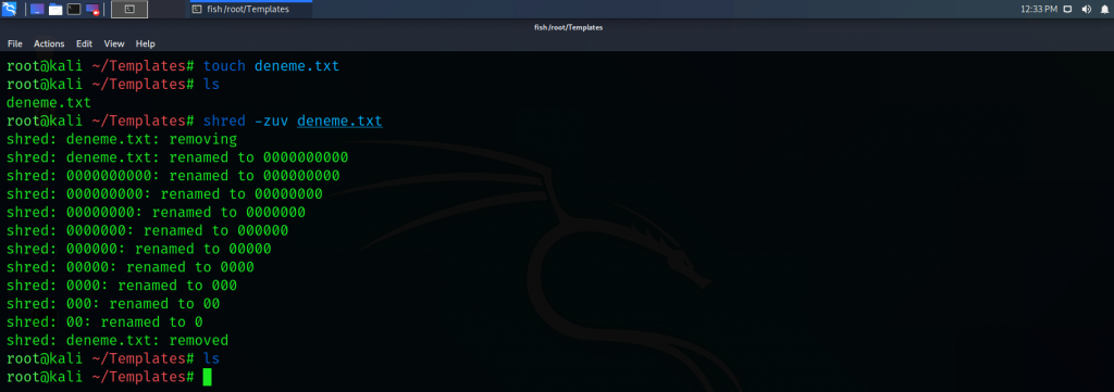 8) shred : Bir dosyanın kurtarılamayacak şekilde sistemden silinmesine olanak tanır. Silinmek istenen dosyanın içerisini sıfırlarla doldurarak dosyanın önce içeriğini değiştirir daha sonra o dosyayı siler. Dosya içeriğini sıfırlar ile doldurmak için “-z” daha sonra dosyayı silmek için “-u” ve işlem sırasında detaylı bilgi almak için ise “-v” parametleri kullanılır. Temel kullanımı “shred -zuv <dosya_ismi> “ şeklindedir.