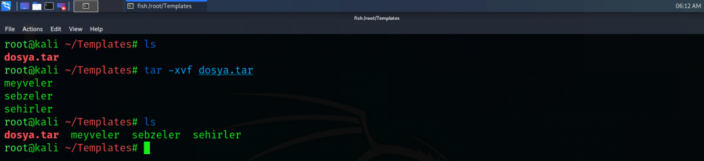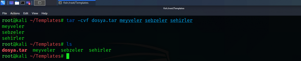 9) tar(tape archive) : Tar komutu birden fazla dosyayı sıkıştırıp arşivlemek ve önceden arşivlenmiş olan dosyaları arşivden çıkartmak için kullanılır. Temel kullanımı “tar -cvf <yeni_tar_dosyası> <arşivlenecek_dosya_1> <arşivlenecek_dosya_2> …“ şeklindedir. Bir arşivden dosyaları çıkartmak için kullanılacak komut ise “tar -xvf <tar_dosyası>” şeklindedir. “-c” parametresi bir tar dosyası oluşturur, “-x” parametresi tardan dosya çıkartma işlemi yapar , “-v” parametresi işlem hakkında detaylı bilgi verir son olarak “-f” parametresi ise bir dosya adı girmemize olanak sağlar.