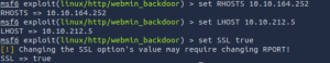 LHOST , RHOSTS ayarını vermem gerekiyor ve SSL ayarını da true olarak değiştirmem gerekiyor. “set” komutuyla ayarları veriyorum.