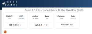 Ve gördüğümüz gibi şifre girerken “*****” karakterini görüyoruz.Şimdi root yetkisine erişmek için exploiti çalıştırmamız lazım.Bu açığın CVE-2019-18634 olduğunu biliyoruz ve buna uygun exploitleri araştırabiliriz.