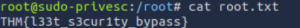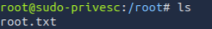 “root.txt” dosyasının burda olduğunu görüyoruz ve “cat root.txt” komutu ile dosyayı okuyoruz.