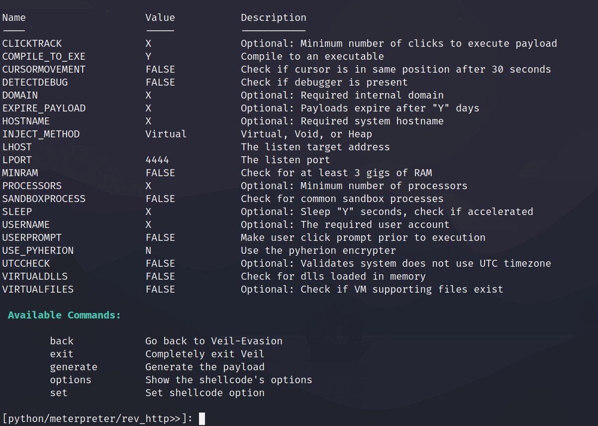 Veil aracını terminale “veil” yazarak çalıştırınız(Eğer github üzerinden kurulum yaptıysanız “./Veil.py” komutunu uygulamanız gerekir).