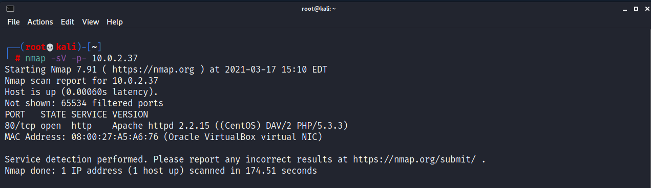 Öncelikle her zaman ki gibi nmap -sV -p- 10.0.2.37  (ip adresi farklılık gösterebilir) komutunu çalıştırarak hedef sistemdeki bütün portları tarıyoruz. ( Nmap aracı ile daha gelişmiş taramalar yapmamız mümkün,detaylı öğrenmek daha faydalı olacaktır)