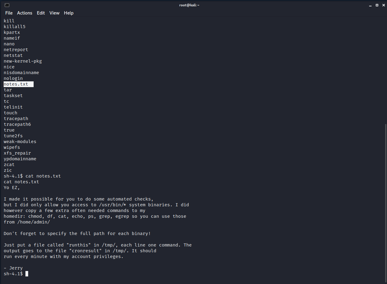 cat notes.txt komutu ile bu dosyanın içeriğini görüntülediğimizde ise bizlere Jerry isimli bir kullanıcı tarafından bırakılmış; /home/admin dizinini kullanarak chmod, df, cat, echo, ps, grep ve egrep komutlarını kullanabileceğimiz ve ayrıca  /tmp dizinine giderek “runthis” ismiyle bir dosya oluşturduğumuzda, bu dosyanın sistem tarafından çalıştırılarak cronresult adında her dakika çalışacak yeni bir dosya üreteceğini belirttiği bir not görüyoruz.
