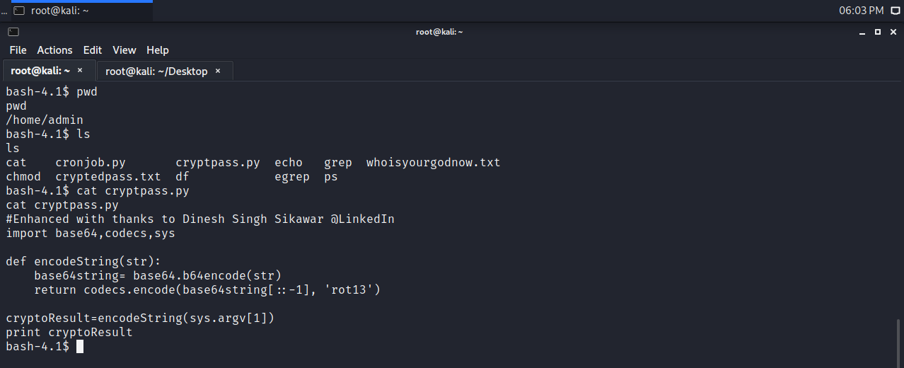 Yukarıdaki görselde de gördüğümüz gibi cd admin komutu ile önceden giremediğimiz admin dizininin içerisine şuanda girebiliyoruz. İçeriği görüntülediğimizde ise bazı ilginç dosyaların olduğunu görüyoruz. cat cryptpass.txt komutunu çalıştırdığımızda burada şifreleme algoritması çalıştıran bir python scripti olduğunu anlıyoruz