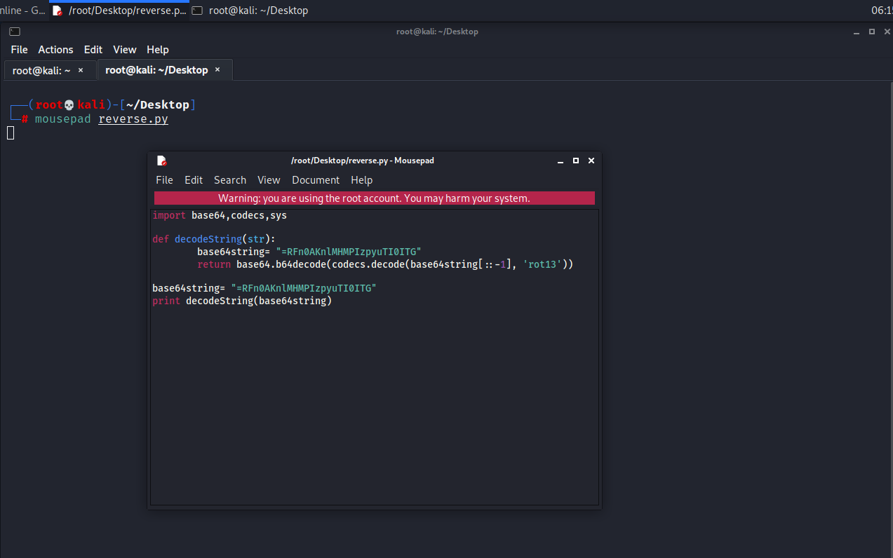 cat cryptedpass.txt komutunu çalıştırdığımızda ise içerisinde “=RFn0AKnlMHMPIzpyuTI0ITG” şeklinde bir hash görüyoruz. Elimizdeki bu python kodlarını tersine tekrar yazarak hash den parolaya gitmeyi deneyebiliriz. Bunun için aşağıdaki görselde gördüğümüz python kodunu kullanabilir ve hash algoritmasını tersine mühendislik uygulayarak düz metin olarak elde edebiliriz