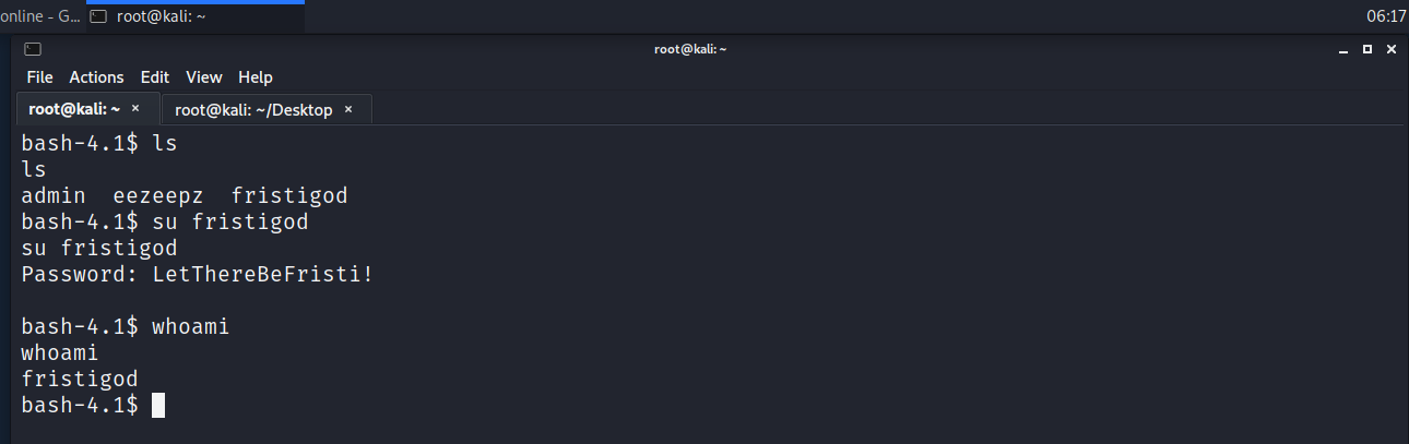 Elde ettiğimiz bu parola ile “fristigod” kullanıcısı olmayı deneyebiliriz. Bunun için su fristigod komutunu çalıştırıyoruz ve elde ettiğimiz parolayı giriyoruz.