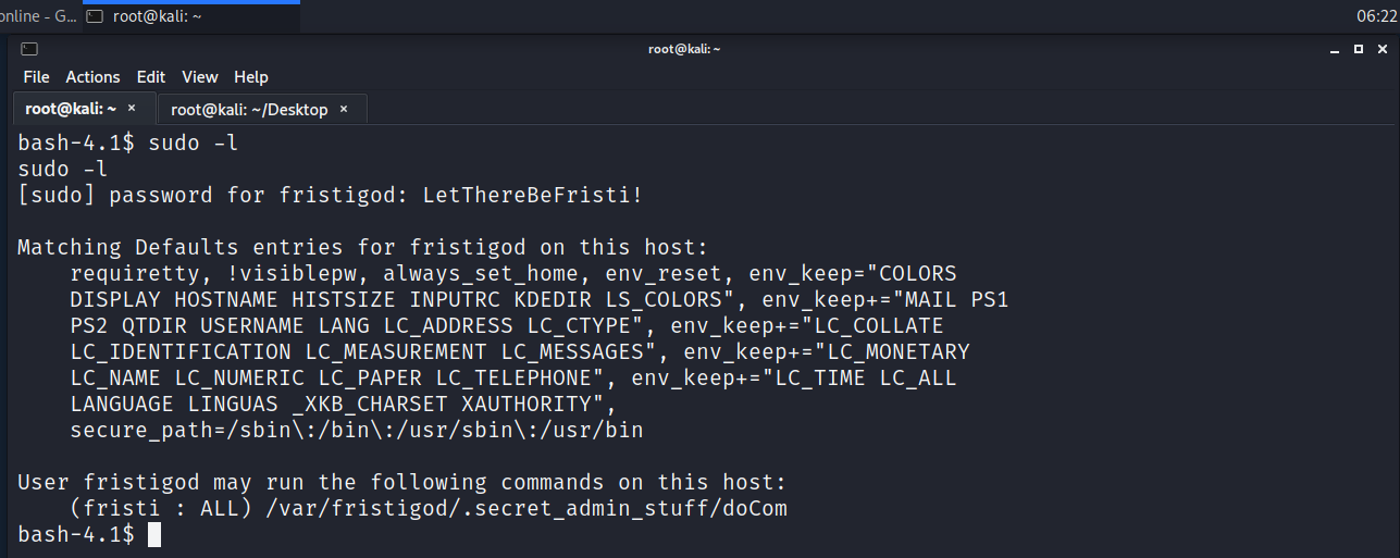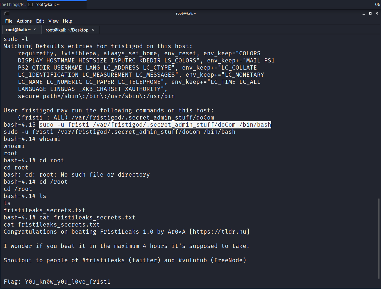 Bunun için ise sudo -u fristi /var/fristigod/.secret_admin_stuff/doCom /bin/bash komutunu çalıştırıyoruz