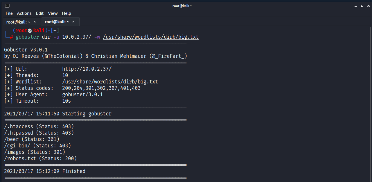 Oluşan çıktıyı incelediğimizde /robots.txt , /beer , /images dizinlerinin varlığını ve bu dizinlerin erişilebilir olduklarını görüyoruz (403 kodu olan dizinlere erişemeyiz). Robots.txt dizini genellikle Google Crawlerlarının erişilmesinin istenmediği dizinleri belirtmek için kullanılan bir dizindir. Bu dizini incelemek her zaman faydalıdır