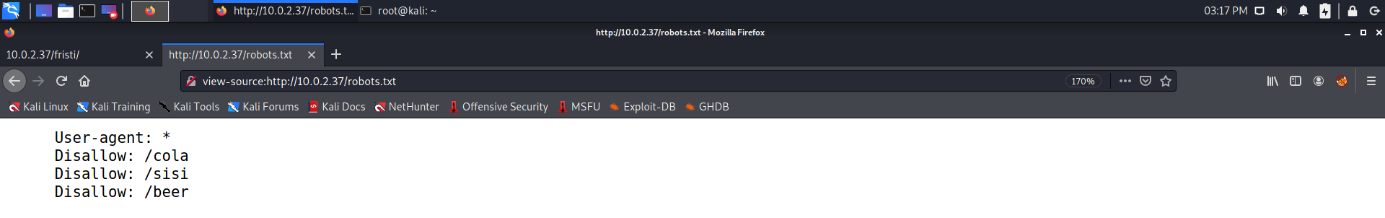 Yukarıdaki görselde de görüldüğü gibi /cola , /sisi, /beer dizinlerine erişilmesi istenmemektedir. Biz bu dizinlere eriştik ancak içerilerinde kayda değer bir bilgiye rastlayamadık, bu aşamada vulnhub sitesindeki ctf tanımında fristi adında bir içecek içtiklerinden bahsediliyordu, bu isimde gizli bir dizin olup olmadığını araştırıyoruz