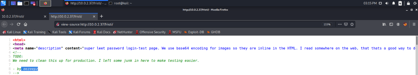 Gördüğümüz gibi gerçekten de bizim için faydalı olabilecek bir şeyler var, burada eezeepz adlı bir kullanıcının varlığını öğreniyoruz ve kodu biraz daha incelemeye devam ettiğimizde aşağıdaki görselde de görüldüğü gibi base64 ile hashli bir yorum satırı daha bırakılmış