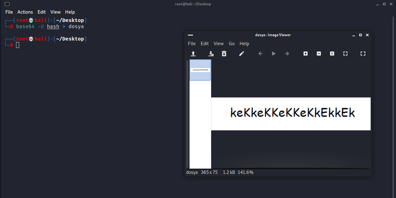 Şimdi ise yapmamız gereken bu hashi decode etmeye çalışmak ve içerisindeki bilgiye erişmek. Bunun için öncelikle buradaki hashi kopyalıyoruz ve hash adında yeni bir dosya oluşturarak içerisine yapıştırıyoruz. Daha sonra base64 -d hash > dosya komutunu kullanarak hashi kırıyor ve içerisindeki metni dosya adında yeni bir dosyaya yazdırıyoruz