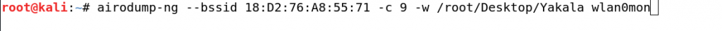 Parolasını kırmak istediğimiz ağın BSSID ve Kanal numarasını alıyoruz ve yeni bir terminal penceresi açıp airodump-ng –bssid 18:D2:76:A8:55:71 -C 9 -w /root/Desktop/Yakala wlan0mon komutunu yazıyoruz.