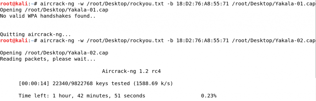 Şimdi yeni bir terminal penceresi açıp aircrack programını çalıştırıyoruz. Bu program WEP, WPA/WPA2 şifrelerinin kırılması için en çok kullanılan Kali araçlarından biridir. Şimdi gerekli komutu yazalım. İlk seferde Yakala-01.cap dosyası içinde WPA handshake paketleri bulunamadığı için Yakala02.cap yazdık.