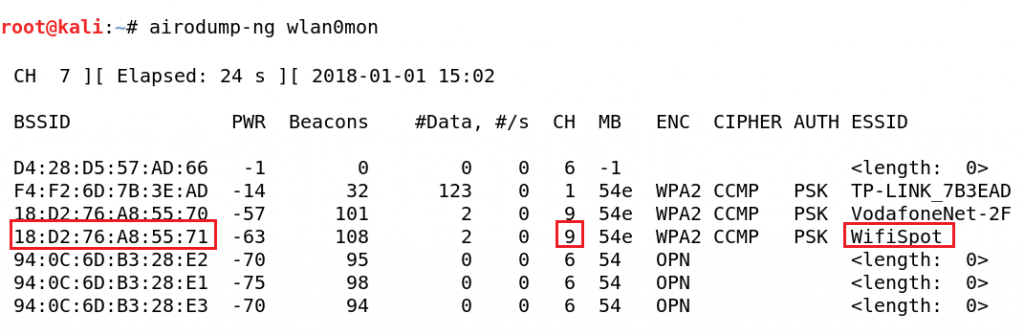Şimdi de çevremizde yayın yapan kablosuz ağları görüntüleyelim. Bunun için airodump-ng wlan0mon komutunu kullanıyoruz.
