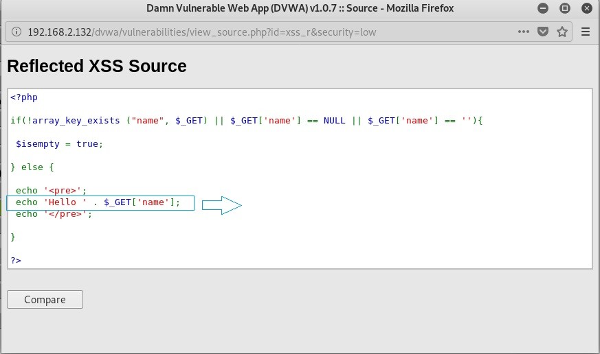 Kaynak kodunu incelediğimizde “echo ‘Hello’ “ komutundan sonra nokta ile GET metodunu birleştirmiş. Burada GET metoduna karşı hiçbir önlem alınmadığını ve denetlemeye tabi tutulmadığını görüyoruz. Bunun anlamı istediğimiz html kodunu ya da özel karakteri sayfada çalıştırabileceğimizdir.