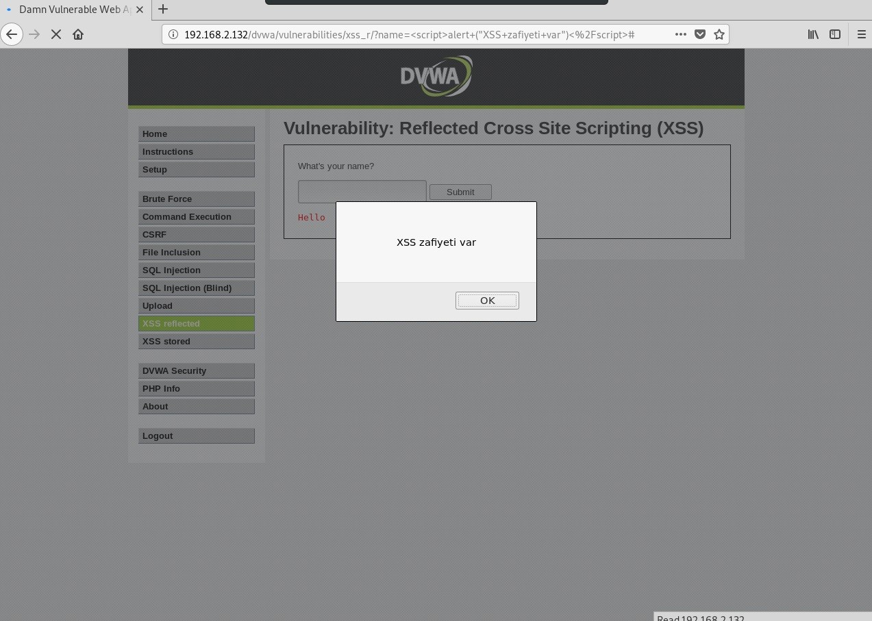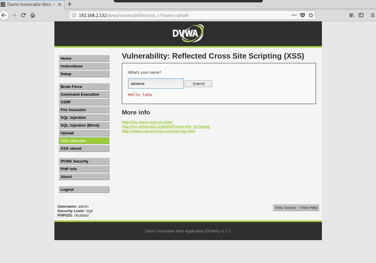 Saldırının nasıl yapıldığına gelecek olursak DVWA’dan XSS reflected(low) kısmını açalım. Birkaç deneme yapalım. Yaptığımız bütün denemeleri ekrana yazdırdığını göreceğiz.
