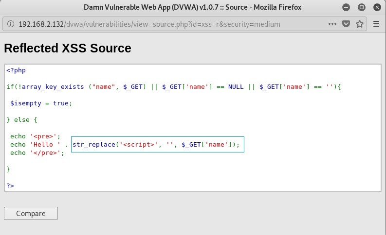 Buna önlem alınmış bir seviyeyi yani DVWA’yı medium seviyesini inceleyelim. Kaynak kodunu incelediğimizde GET metodundan önce <script> etiketine önlem alındığını görüyoruz. Burada str_replace fonksiyonun eğer bir <script> etiketi görürse onu sildiğini görebiliyoruz. Peki biz iki tane <script> etiketi kullanırsak GET metodu ne yapabilir ki?