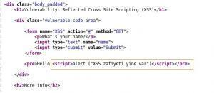 Şimdi javascript kodunu form alanına yazıp neler olacağını görelim. ‘<script> alert (“XSS zafiyeti var”)</script>’ kodunu yazıp submit diyoruz ve küçük bir pencere açılıp yazdığımız mesaj kullanıcıya gösteriliyor. Burada daha zararlı bir komut kullansaydık cookie çalma, sayfanın içinde başka sayfaya yönlendirme gibi işlemler yapabilirdik.