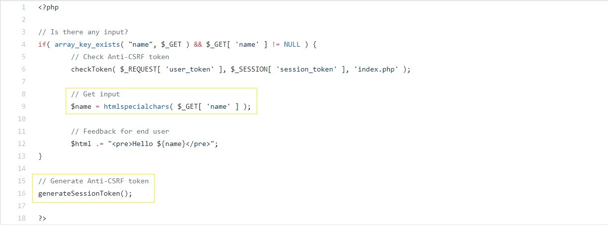 High levele baktığımızda ise htmlspecialchars() fonksiyonunu görüyoruz. Bu kullandığımız özel karakterleri engelliyor ve normal karaktere dönüşmesini sağlıyor. Bir de kullanıcıların güvenliği için anti-CSRF token güvenlik mekanizmasının uygulandığını görüyoruz.